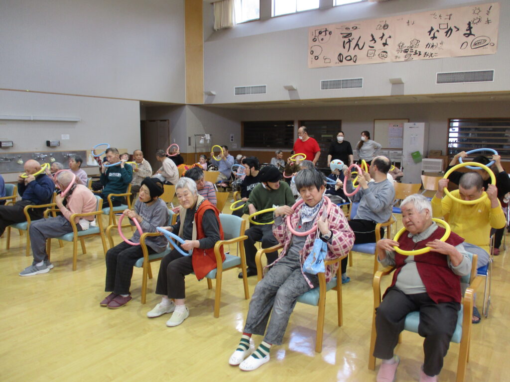 松風園ではリズム体操という音楽に合わせて体を動かす活動を行ってきました😊